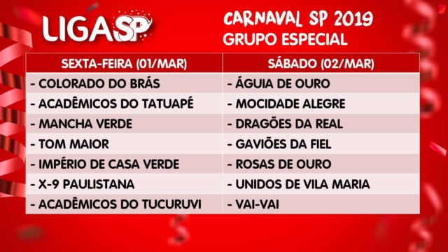 Liga SP, “Rumo ao Maior Carnaval do Brasil”, realizou na noite desta segunda-feira (28 de maio) o sorteio para determinar o dia dos desfiles das escolas do Grupo Especial. O encontro contou com a presença do presidente da entidade, Paulo Sérgio Ferreira, dos dirigentes e representantes das agremiações do Grupo Especial para estabelecer este importante cronograma do Carnaval SP 2019.