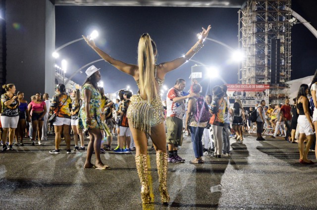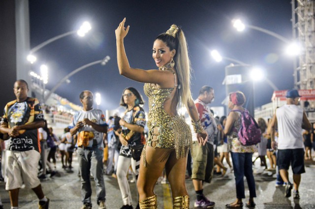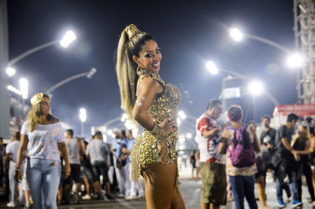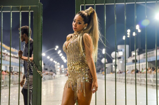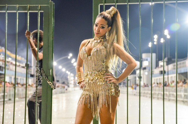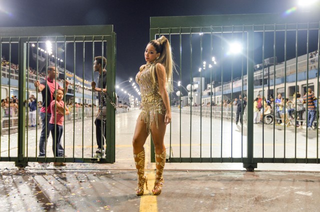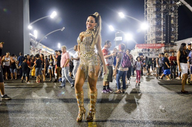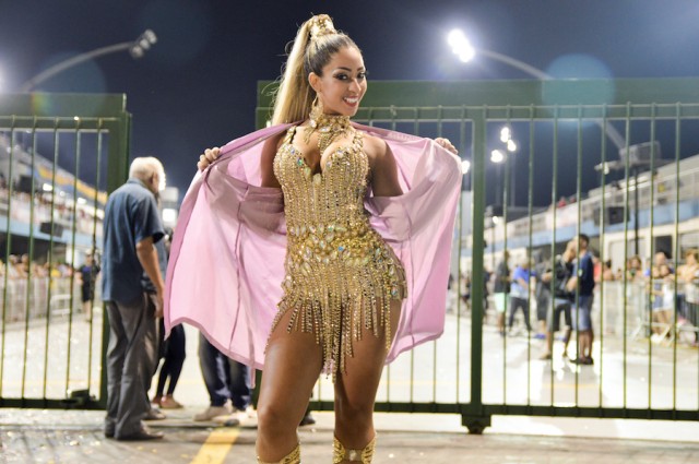 Usando um vestidinho decotadíssimo e cheio de brilho, Magda deixou em evidência seus pernões e roubou a cena ao circular pelo lado de fora do Sambódromo. Para o desfile oficial, ela prepara uma fantasia bem comportada. “O enredo é religioso, então não rola vir para a avenida com pouca roupa. É questão de respeito. Tenho bom senso”, explicou.
