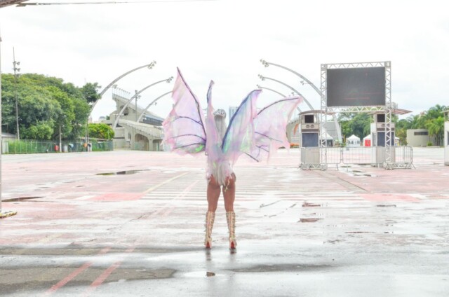 A modelo também resolveu vestir sua fantasia de borboleta, que seria finalizada para o desfile oficial e posou na concentração do Anhembi. “Minha fantasia seria voltada para a natureza, inspirada em uma borboleta que se torna fada. Espero que o desfile possa acontecer ainda esse ano. Quero realizar esse desejo e brilhar na avenida.”