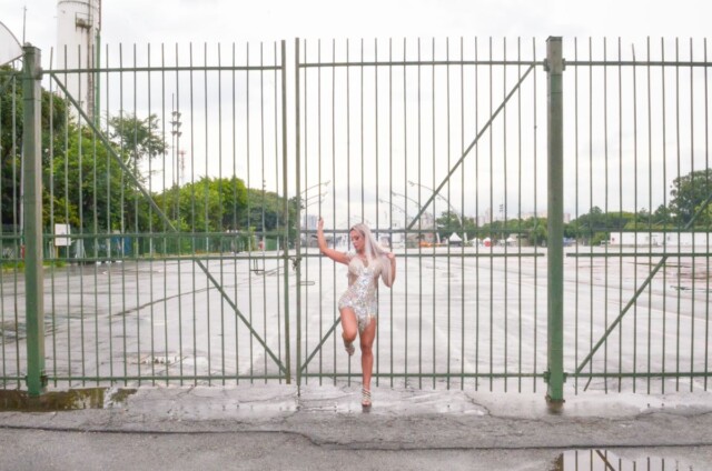 À bordo de um body prateado, cravejado de brilhantes, Andréia posou sensual junto às grades trancadas do sambódromo. “Esse era um dos figurinos que eu tinha preparado para os ensaios, caso fosse permitido o desfile. Infelizmente não consegui usar no ensaio, mas não perdi a oportunidade de sentir a emoção de estar nesse local”, disse emocionada.