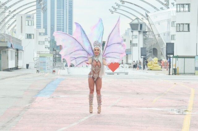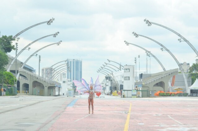 A modelo também resolveu vestir sua fantasia de borboleta, que seria finalizada para o desfile oficial e posou na concentração do Anhembi. “Minha fantasia seria voltada para a natureza, inspirada em uma borboleta que se torna fada. Espero que o desfile possa acontecer ainda esse ano. Quero realizar esse desejo e brilhar na avenida.”