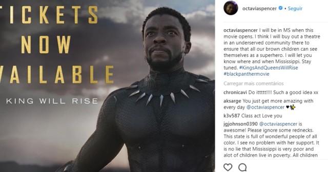 Octavia Spencer mostrou que, além de talentosa, também tem um coração enorme. A atriz de A Forma da Água usou seu instagram para anunciar que bancará sessões de Pantera Negra para crianças carentes do Mississipi.